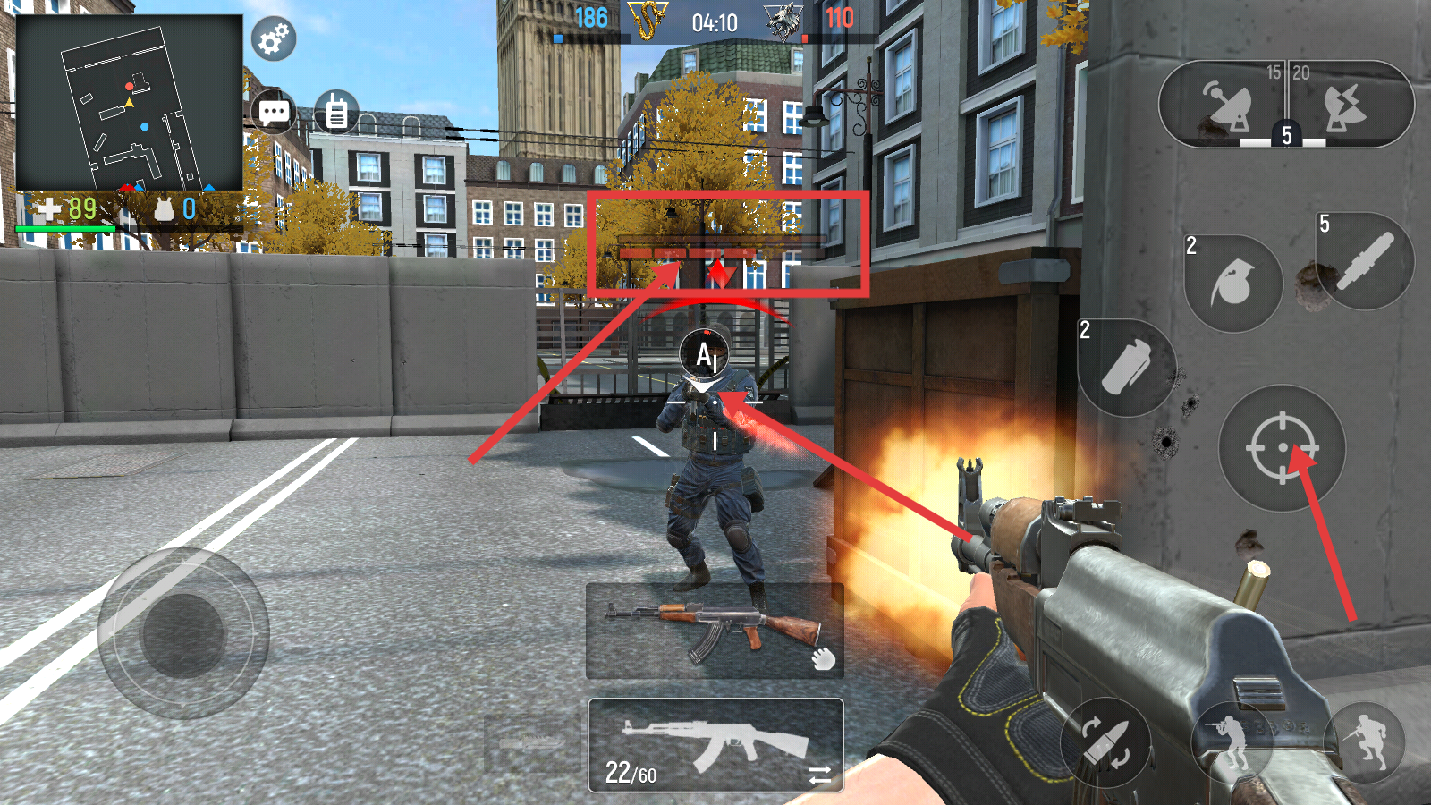 3、遇敌时瞄准敌人,点击射击按钮开火,利用【AK-47】火力压制,注意弹药【22/60】消耗。