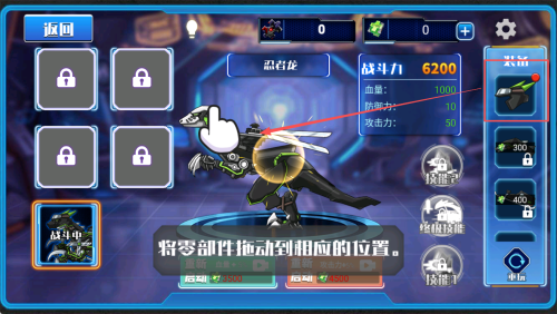 3、组装恐龙:在装备界面,将零部件拖动到相应的位置,完成恐龙的组装。
