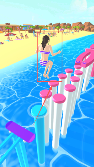 2、操控角色跳跃:移动手指控制角色在赛道跳跃,根据赛道起伏与宽度调整跳跃力度,防止落入水中中断闯关。