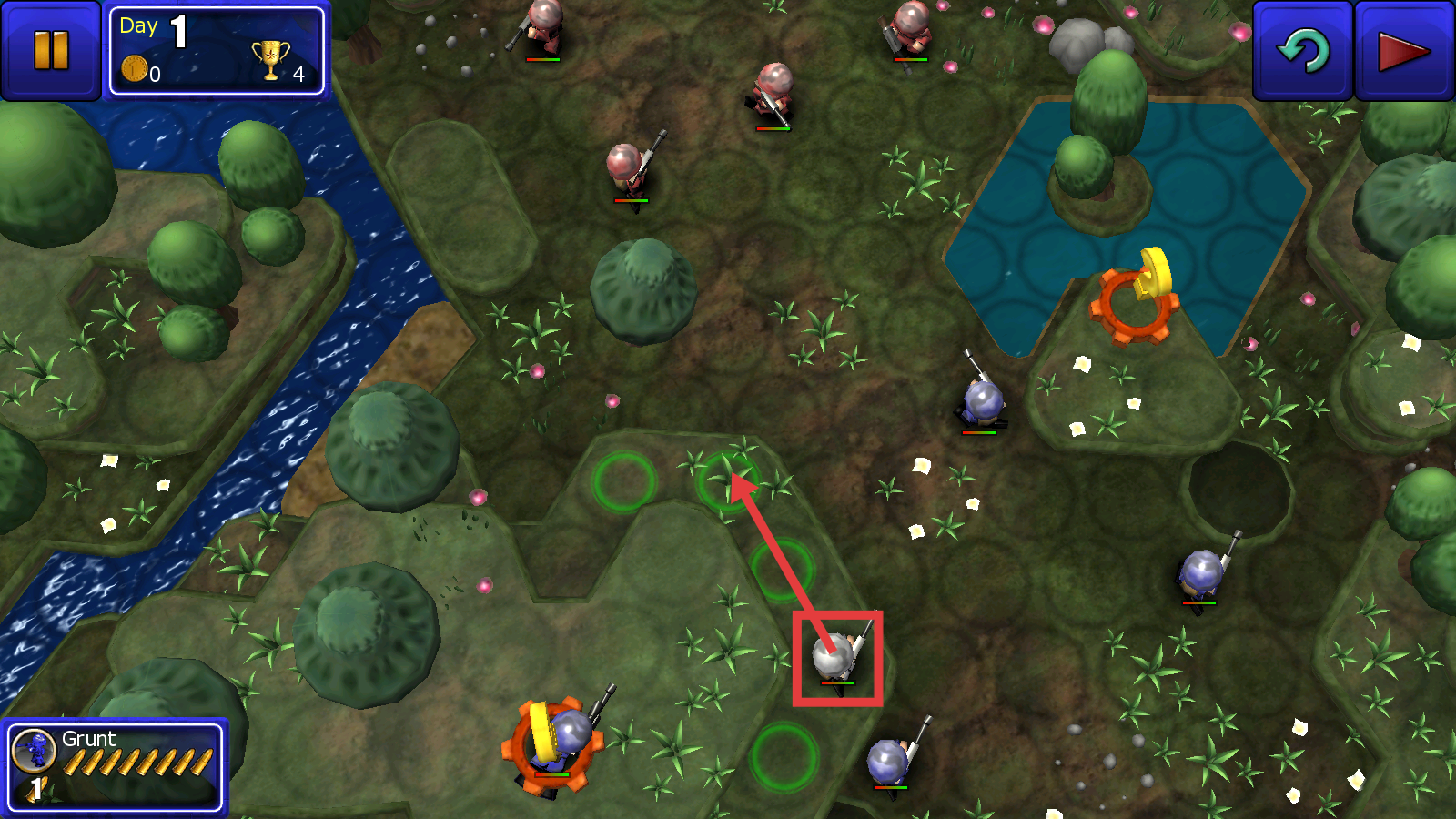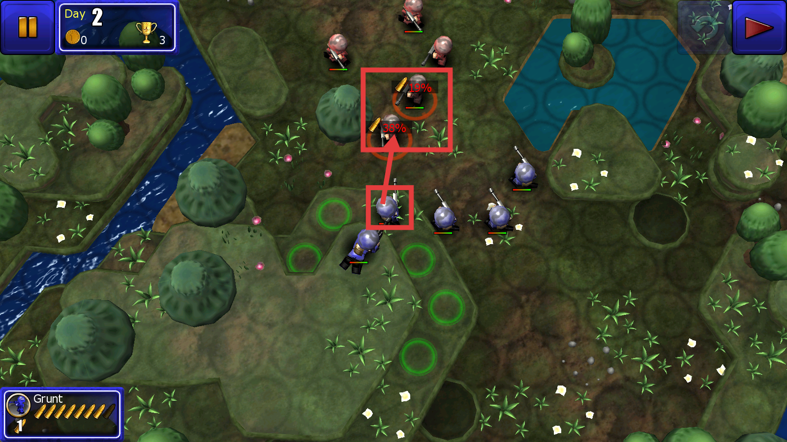 2、在战场中观察士兵的绿色可移动范围,将士兵部署到绿色区域,为作战做好准备。