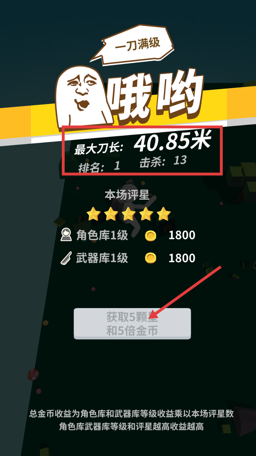 4、战斗结算时关注【最大刀长-40.85米】【排名-1】等数据,利用金币升级角色库和武器库,增加收益。