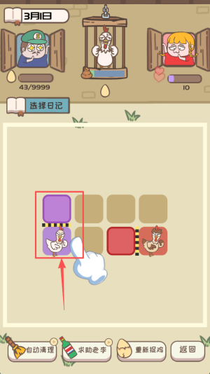 3、然后,当提示“选择日记”时,可点击“重新提鸡”刷新鸡群,或“求助老李”获取额外奖励。
