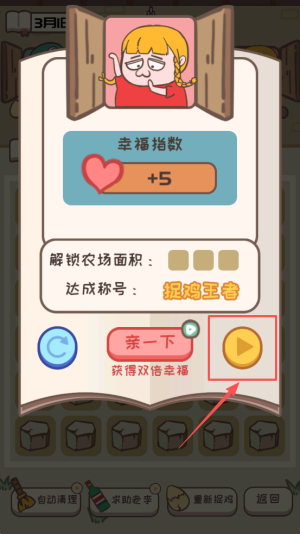 4、最后,解锁“捉鸡王者”称号后,点击“获得双倍幸福”加速成长,继续扩大农场面积。