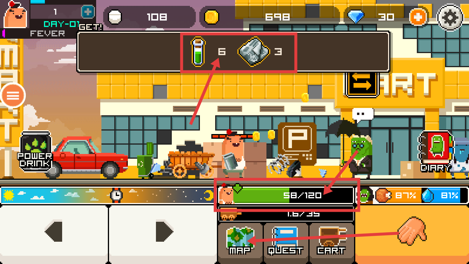 2、收集资源时关注角色血量(如58/120),合理规划行动,避免血量过低。