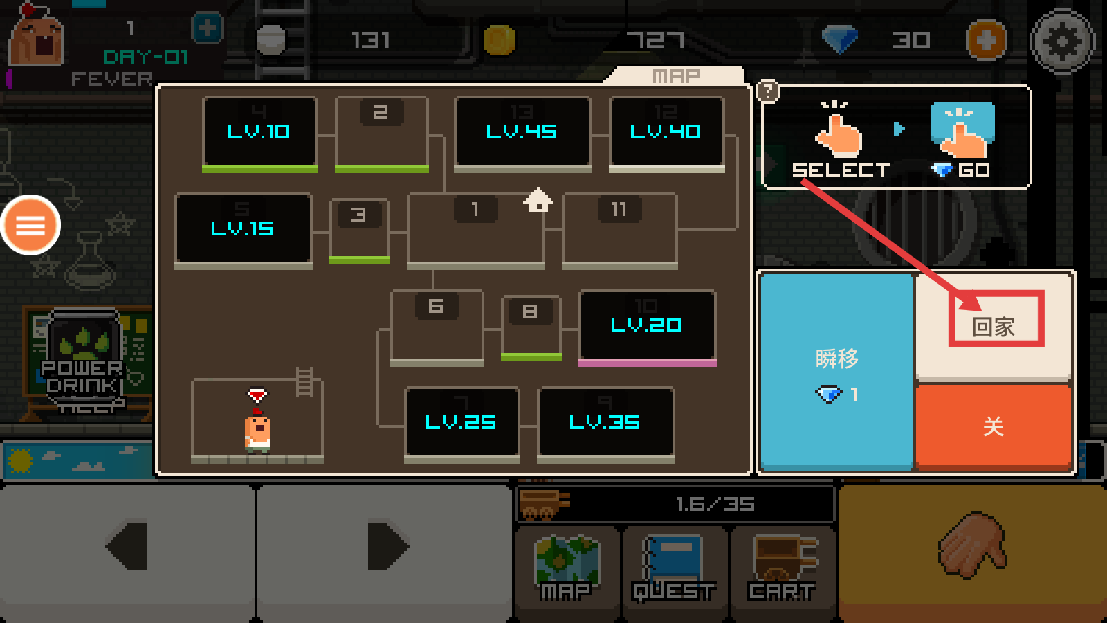 3、在地图界面可选择“回家”,回到基地整理资源或进行升级操作。