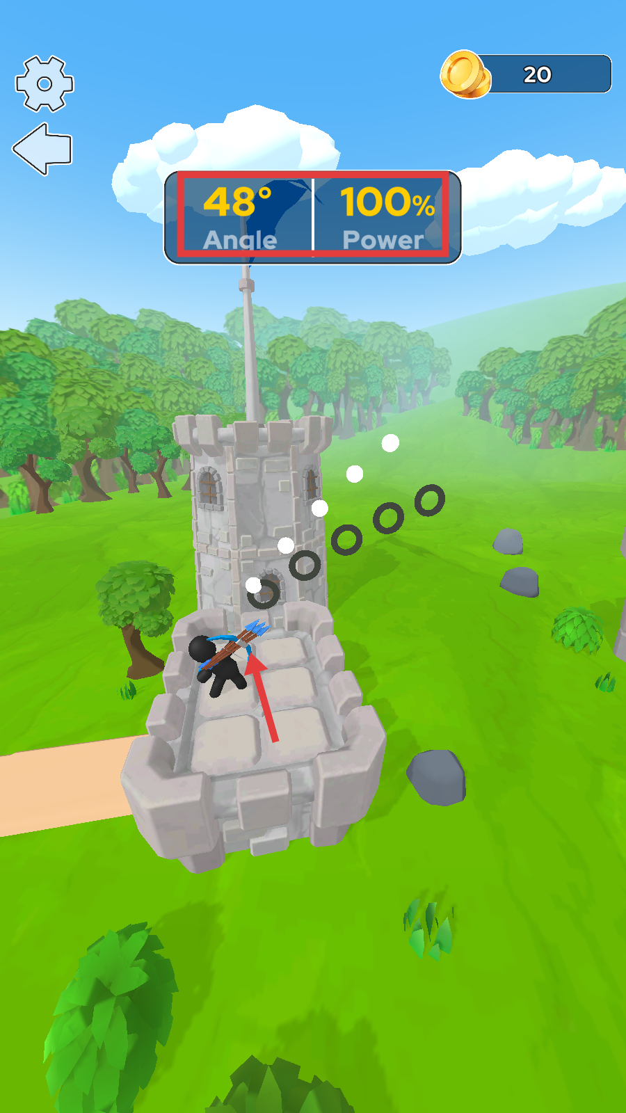 2、调整【Angle-48°】与【Power-100%】,精准控制箭矢轨迹,瞄准敌方城堡,提升命中概率。