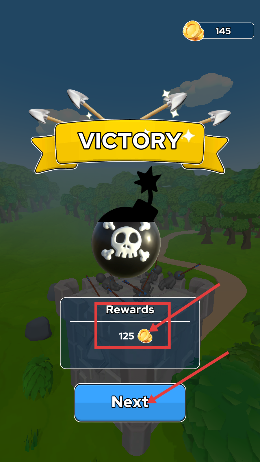 4、战斗胜利后,领取【Rewards-125金币】,点击【Next】进入下一关,持续积累资源以升级强化。