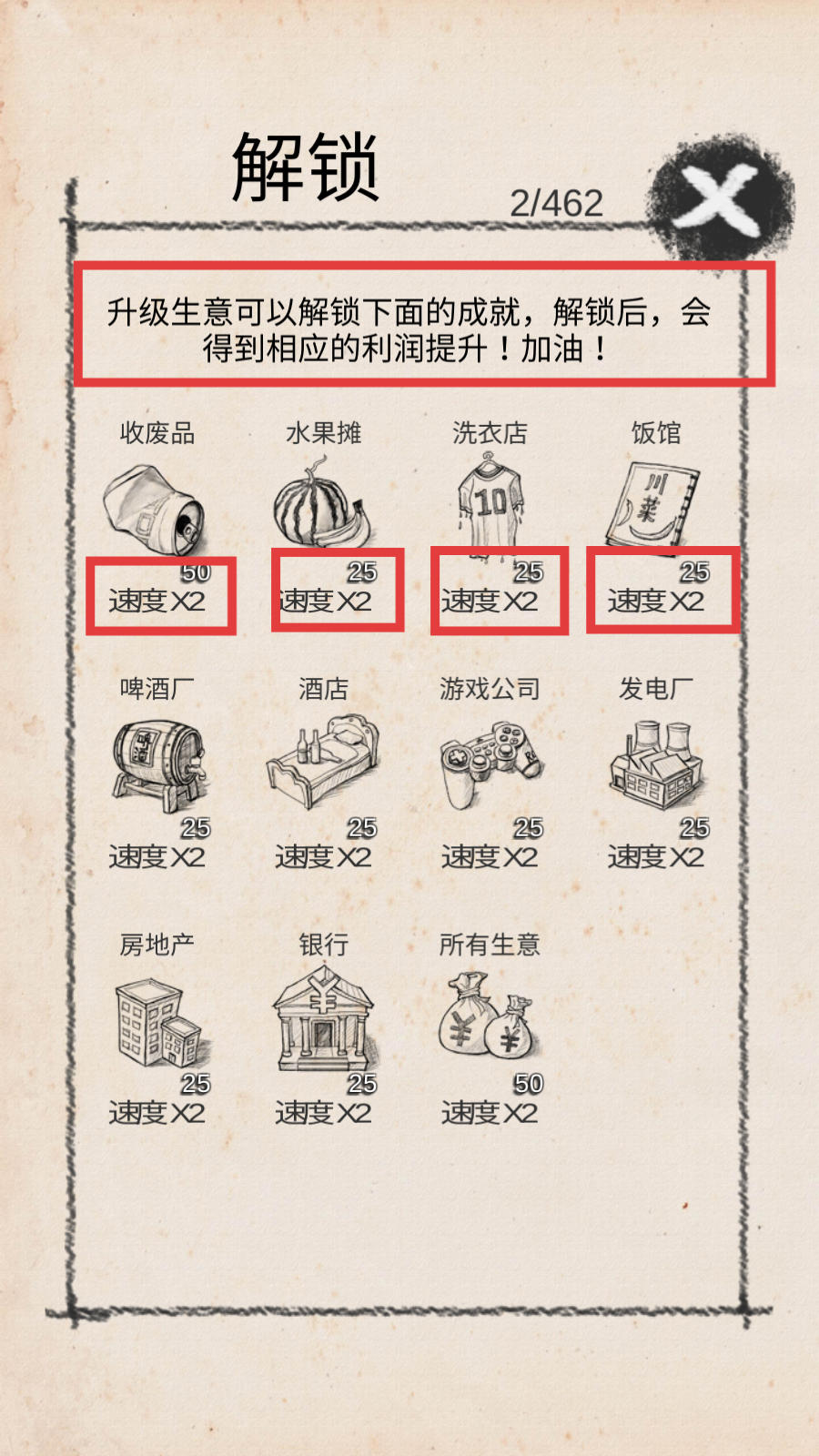 1、升级【收废品】【水果摊】等生意解锁成就,可获得【速度×2】的利润提升,助力产业发展。