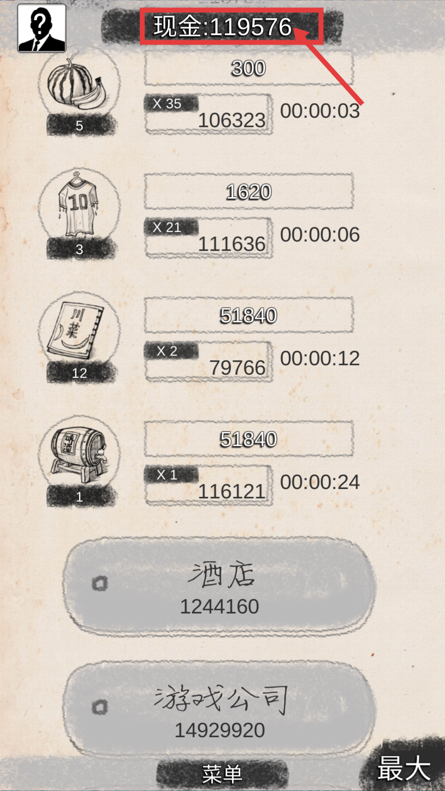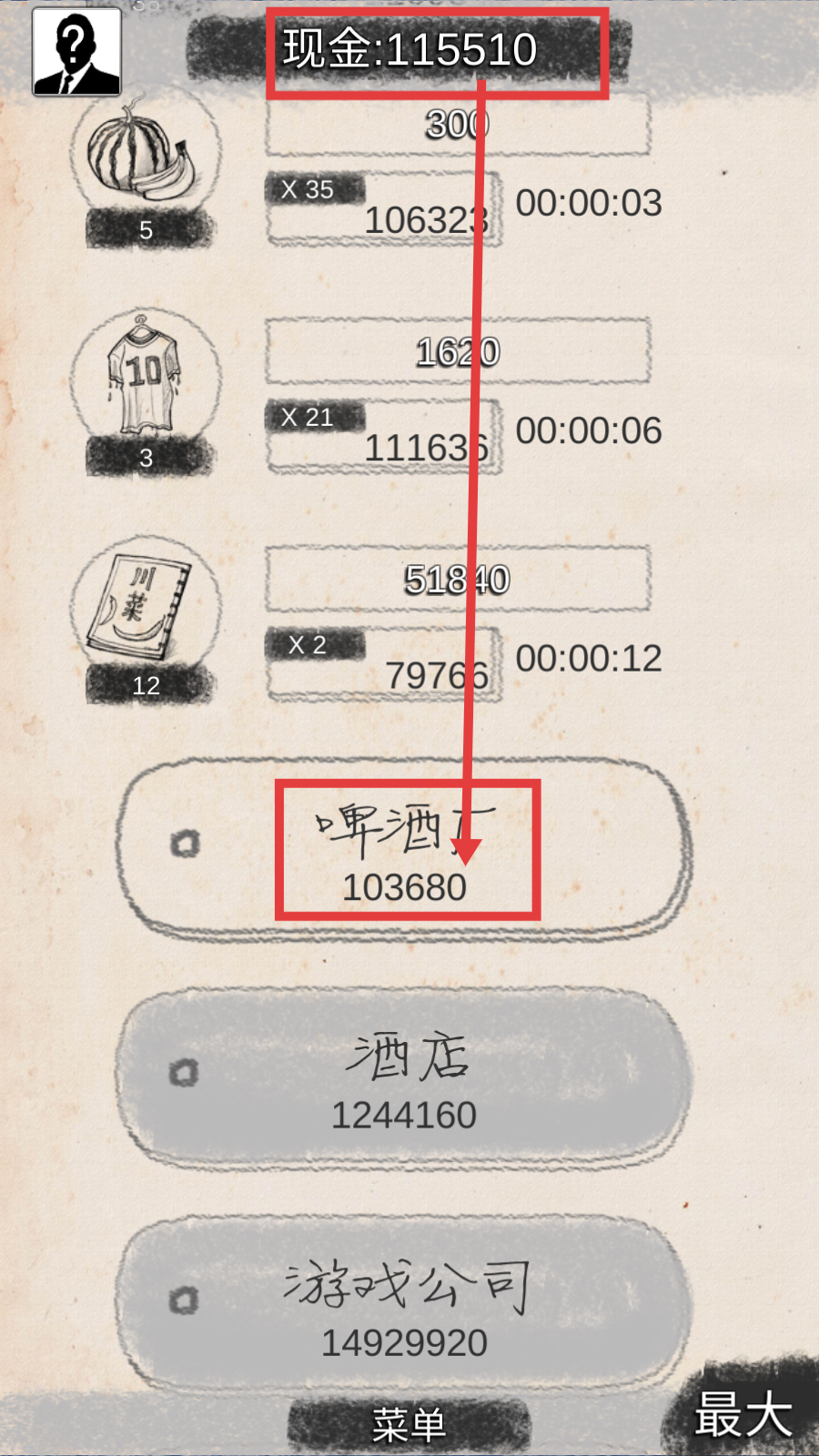 2、积累现金至115510时,投资【啤酒厂-103680】,扩大高收益产业布局。