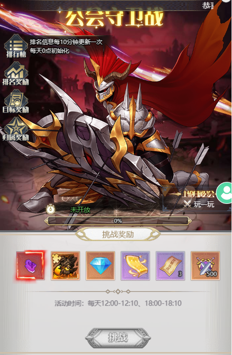 活动时间为每天的12:00-12:10,18:00-18:10,奖励分为挑战奖励、排名奖励、目标奖励和归属奖励,奖励图如下(注意:需要加入公会)