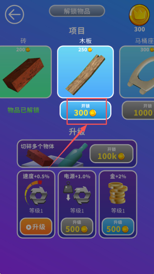 4、最后,当金币足够时点击“升级”按钮,继续切碎更多物体并累积100k金币,循环解锁新道具、提升效率。