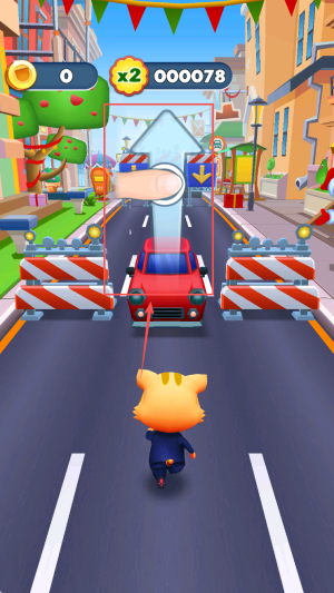 1、控角色躲障碍:操控小动物角色在赛道奔跑,遇到障碍物时及时滑动屏幕躲避,比如向下滑钻过矮栏、向上滑跳过高墙。