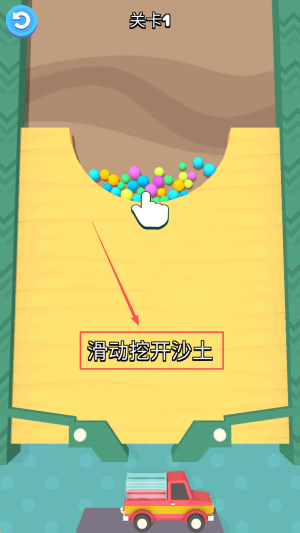 1、见提示「滑动挖开沙土」后,按住屏幕拖出通道,让角色沿斜坡滑落。