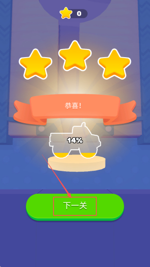 4、弹出「恭喜!14%」点「下一关」,立即进入更高难度地图。