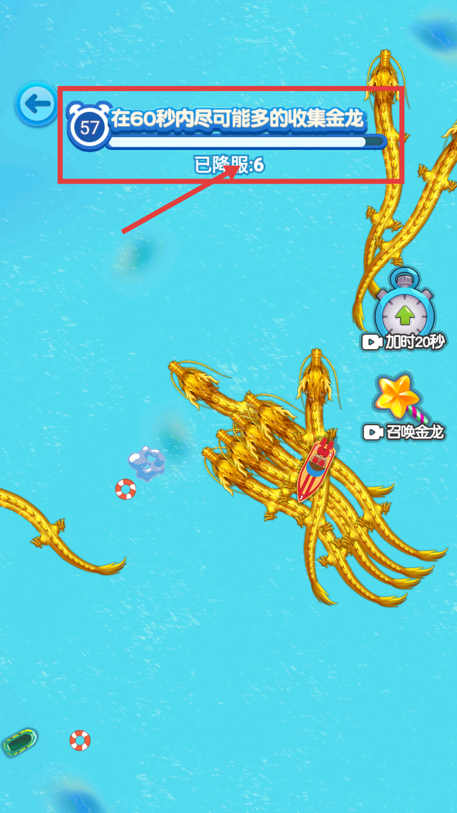 2、在【60秒内尽可能多的收集金龙】任务中,快速行动,关注【已降服-6】的数量,争取更多收集。