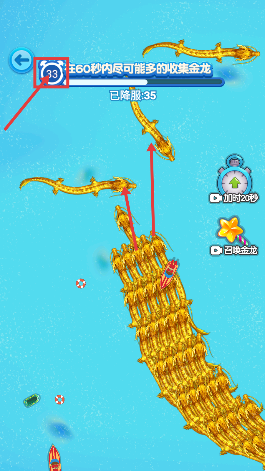 3、剩余【33秒】时,继续高效收集金龙,利用时间优势提升【已降服】数量,冲刺更高成绩。