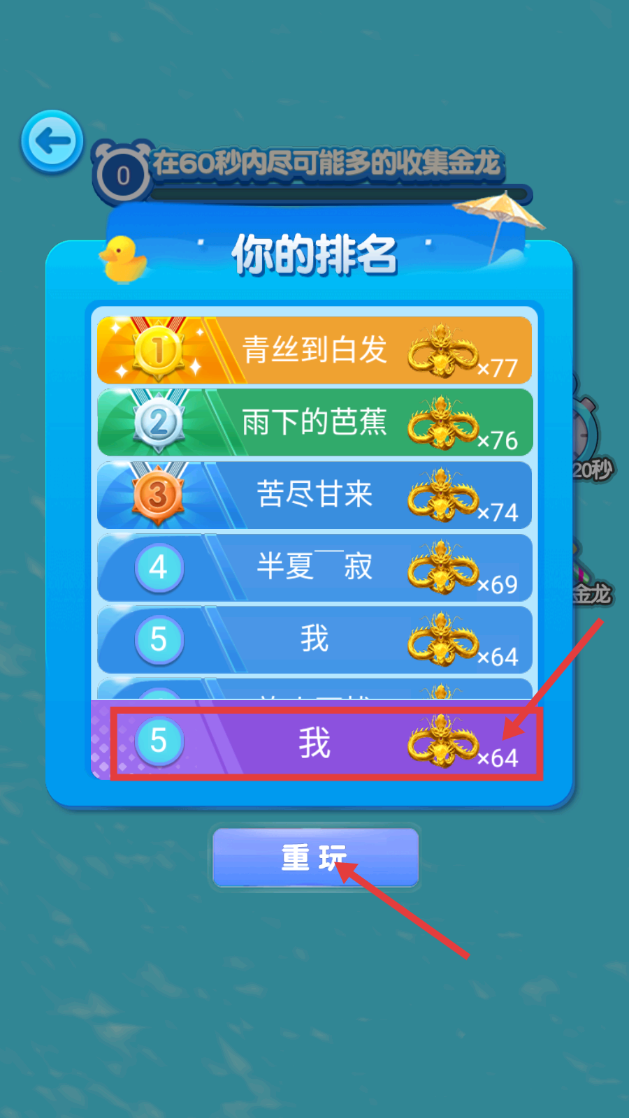 4、游戏结束后查看排名,若获得第5名(如【我-x64】),可点击【重玩】按钮再次挑战,争取提升排名与收集数量。
