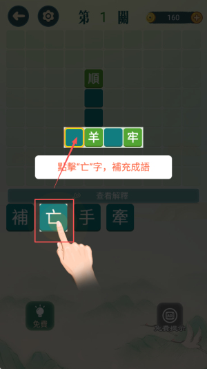 3、在「160 羊 牢」界面,选“亡”字补全“亡羊补牢”,按「補」提交。