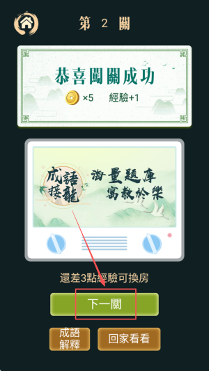 4、弹出「恭喜关关成功」领×5奖励,点「下一个」继续接龙,经验满3点可换房。