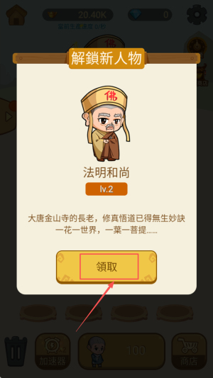 4、当解锁“法明和尚”后,点击领取即可加入队伍,继续挑战更高难度关卡。