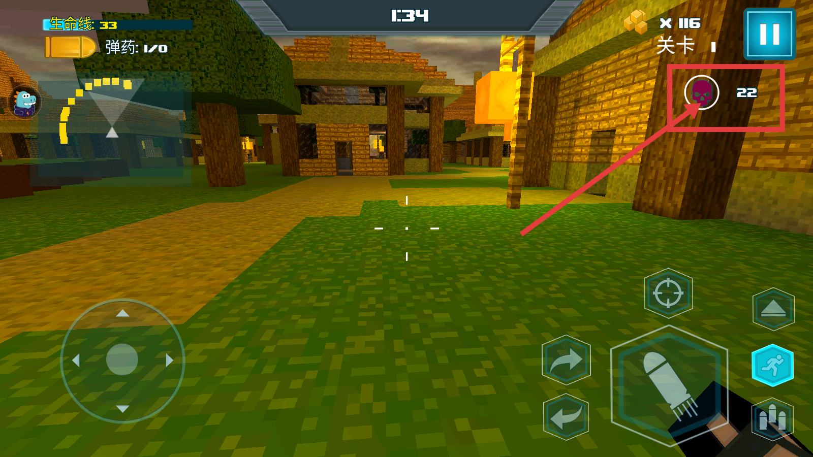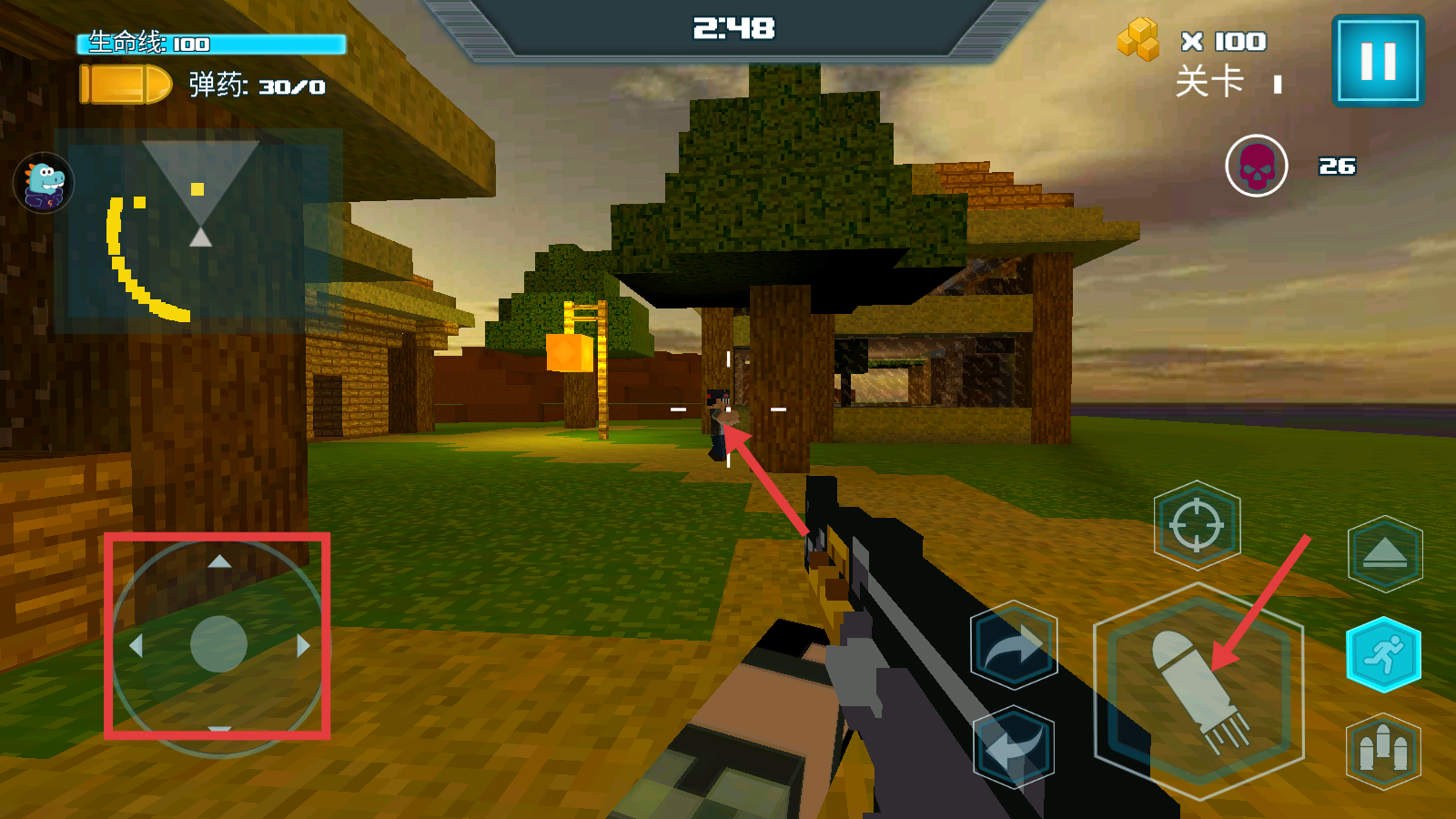 2、用移动摇杆操控角色,点击攻击按钮射击敌人,关注【生命线-100】【弹药-30/0】,稳扎稳打推进关卡。
