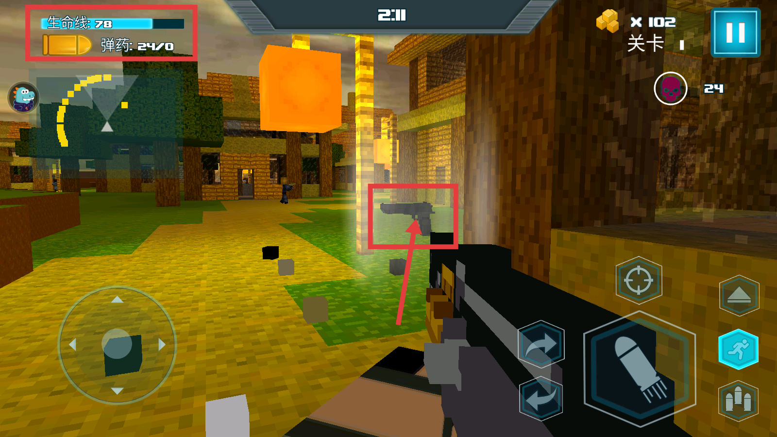 3、收集掉落的枪械,补充武器资源,留意【生命线-78】【弹药-24/0】变化,保持战力。