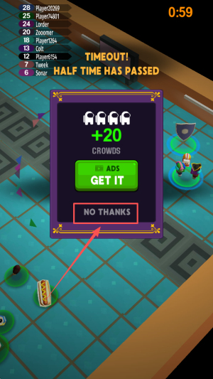 4、倒计时0:59出现TIMEOUT,看广告GETIT拿+20倍奖金,点NO THANKS直接下一局。