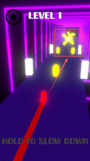 3、然后,按住屏幕任意位置启动“HOLD TO SLOW DOWN”机制,精准控制角色下落速度以避开障碍物。