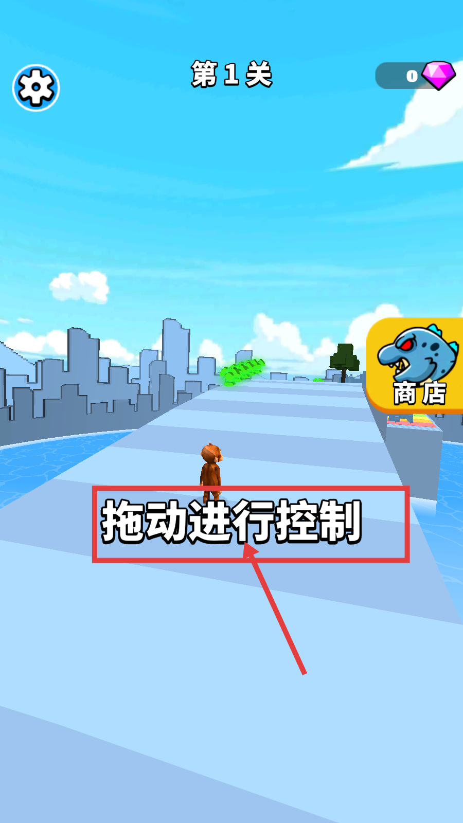 1、第1关时,通过【拖动进行控制】角色移动,开始跑酷挑战,熟悉操作方式。