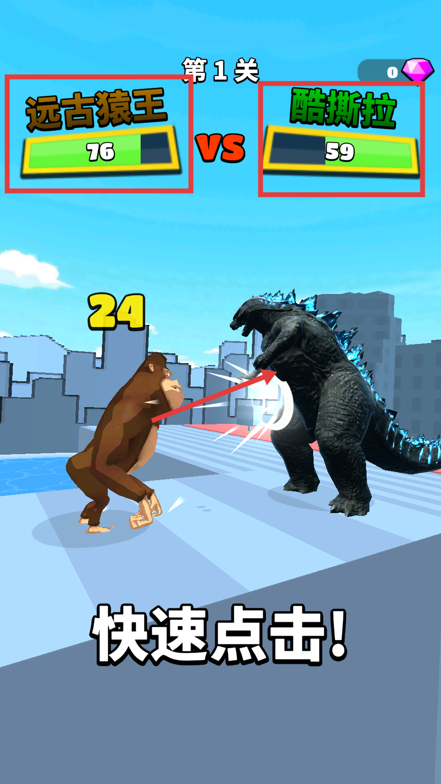 3、对战【远古猿王VS酷撕拉】时,快速点击屏幕提升伤害,利用战力优势击败对手。