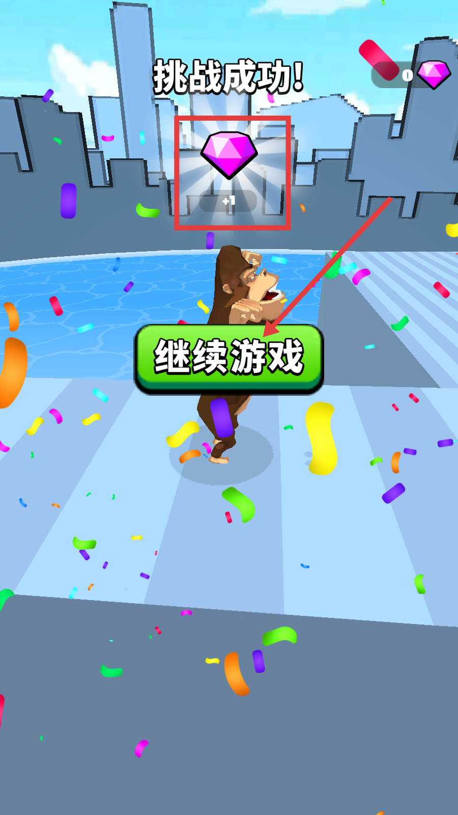 4、挑战成功后,获得【紫色钻石】奖励,点击【继续游戏】,开启下一关挑战积累资源。