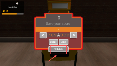 4、最后,在“Insert Coin”界面选择“Add”投币续关,或点击“Validate”保存当前分数后返回主菜单再开一局。