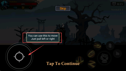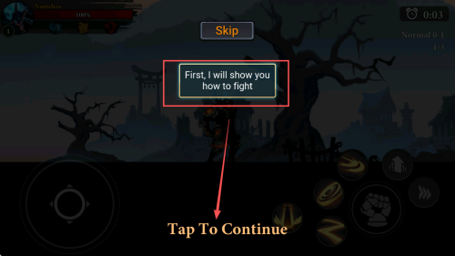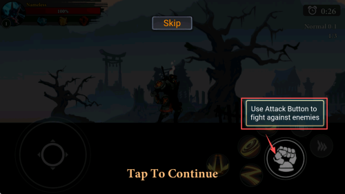4、攻击操作:学习如何使用右下角的攻击按钮与敌人战斗,点击“Tap To Continue”继续教程。