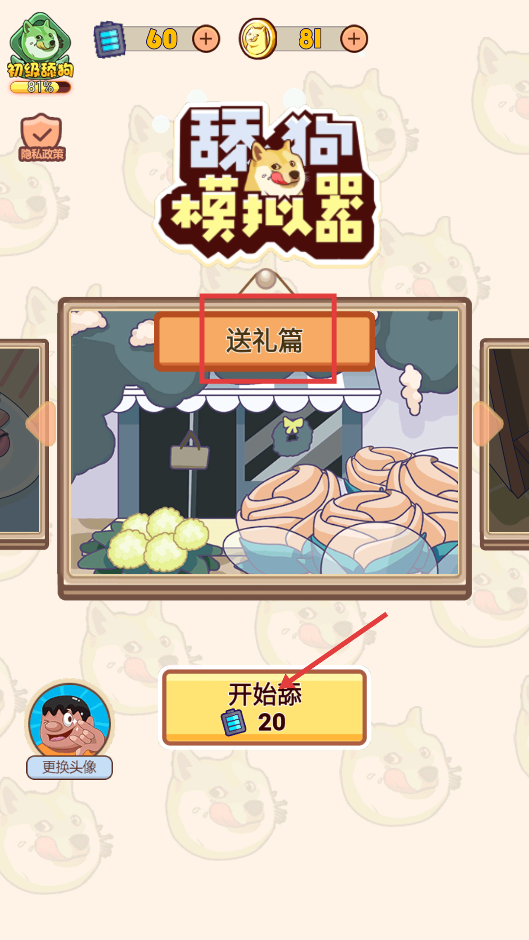 1、进入【送礼篇】界面,点击【开始舔-20】按钮,消耗电量开启送礼相关玩法,推进游戏进程。