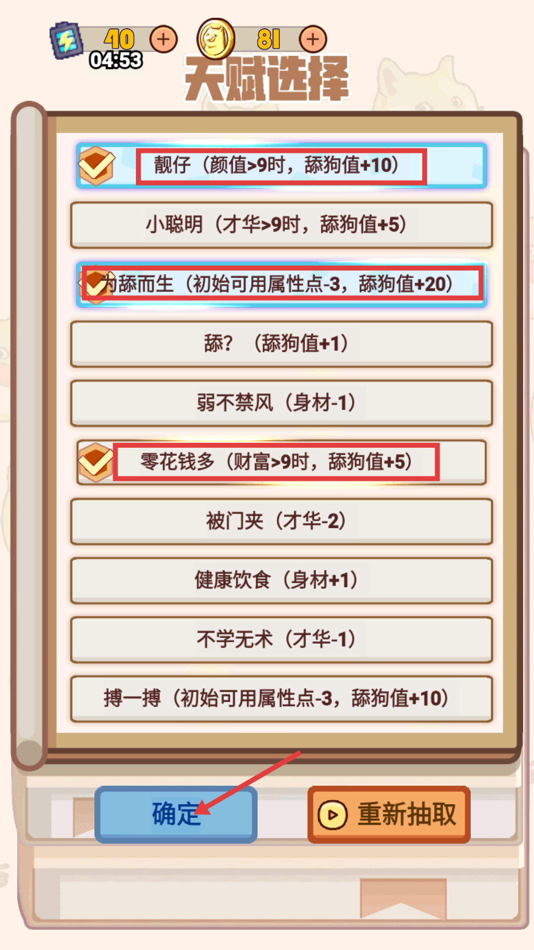 2、在【天赋选择】界面,挑选【靓仔-颜值>9时-舔狗值+10】【零花钱多-财富>9时-舔狗值+5】等天赋,选好后点击【确定】使其生效。