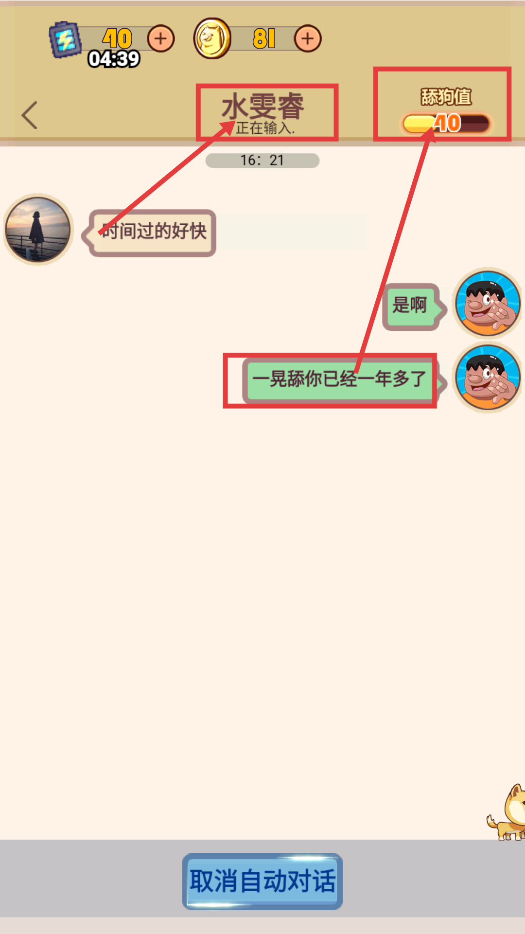 3、与水雯睿对话时,选择如【一晃舔你已经一年多了】的选项,持续提升【舔狗值-40】,关注对话选项对该数值的影响。