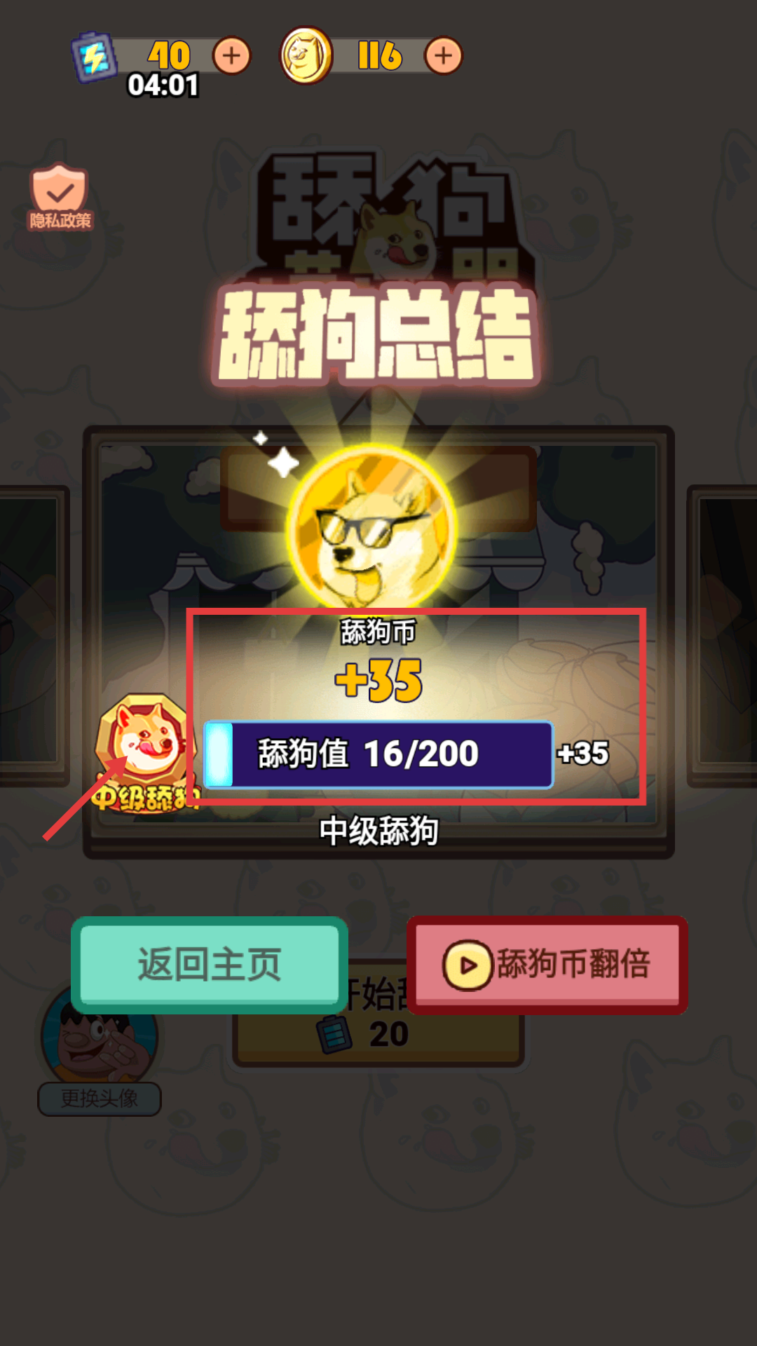4、完成互动后查看【舔狗总结】,可获得【舔狗币+35】,【舔狗值-16/200】提升至中级舔狗,可选择【返回主页】或继续游戏。