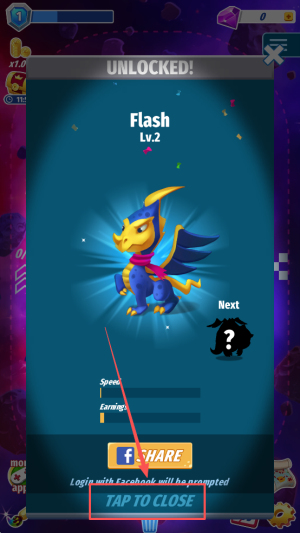 4、最后,若进度卡住,点“TAP TO CLOSE”关闭提示,继续狂点或等待挂机收益,循环解锁更高等级。