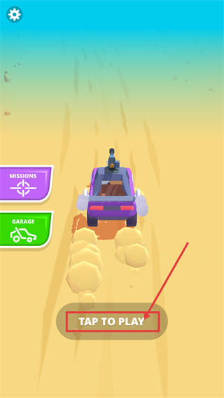 1、点击【TAP-TO-PLAY】开始游戏,操控带武器的紫色车辆进入沙漠竞技场景,开启战斗挑战。