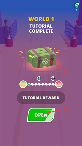 4、完成【WORLD-1】教程后,点击【OPEN】打开【绿色箱子】,获取教程奖励,解锁后续内容。