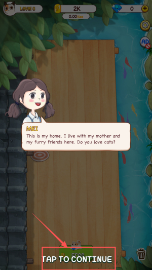 2、在「Level 0」点「TAP TO CONTINUE」跳过剧情,了解这是猫咪的家。