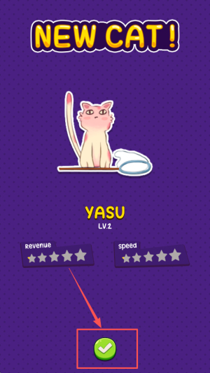 4、出现「NEW CAT! YASU LV.2」时立即解锁,五星提速赚币,循环升级看广告翻倍。