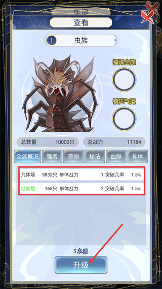 2、进入虫族详情界面,消耗本源点击【升级】,提升【凡体境】【地仙境】等突破几率,强化族群。