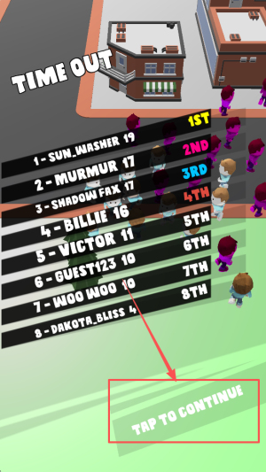 4、若排名靠后,点「TAP TO CONTINUE」立刻再开一局。
