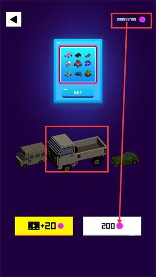 1、消耗【200-紫色货币】,点击【GET】按钮解锁新车辆,积累【999999789-紫色货币】用于后续解锁。