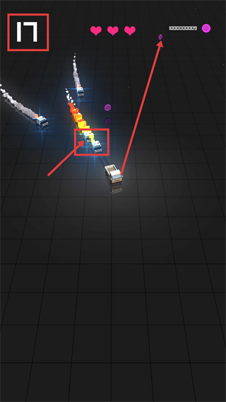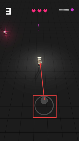 2、通过虚拟摇杆控制车辆移动,保持【3-颗心】生命值,在网格场景中躲避警车追捕。