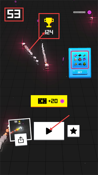 4、关卡结束后,查看【奖杯-124】与分数【53】,点击继续按钮开启下局,或看视频获取【+20-紫色货币】。