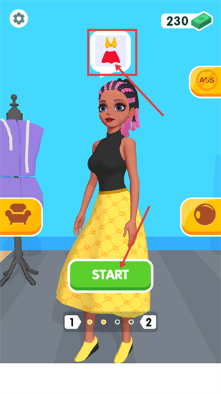 1、点击【START】按钮,根据上方【服装图标】开始服装改造任务,开启时尚设计之旅。