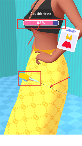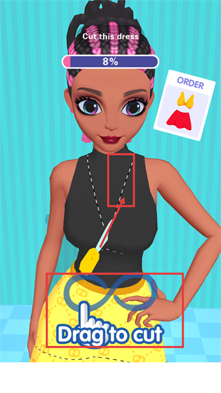 2、按照提示【Drag-to-cut】,沿虚线裁剪服装,完成【Cut-this-dress】的初期裁剪操作。