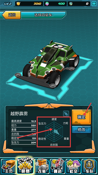 2、选择【越野霹雳】四驱车,查看其【速度】【坠压力】等属性后点击【确定】,为四驱车竞赛做好车辆配置准备。